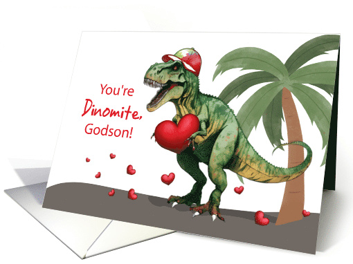 For your godson, this Valentine’s Day card is filled with love and fun. A dinosaur holds a red heart on the front, with the message "You're Dinomite, Godson!" showing just how much you care. Inside, it continues with loving wishes for a day full of joy.