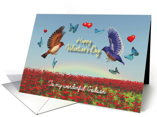 A cute Valentine card for your flowers and animal loving Godson. Two birds are expressing their love to each other surrounded by butterflies and hearts. Behind them there is a romantic rainbow and below a field with red poppies. Inside there is a text which you can customize to something very personal.