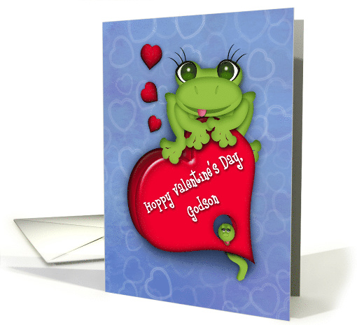 An adorable green frog sitting on top of a heart shaped candy box with a cute little green worm coming out of a hole. On a periwinkle background with white hearts. Heart reads "Hoppy Valentine's Day, Godson. Inside reads. To the sweetest little boy! We love you! Inside message my be changed by you.