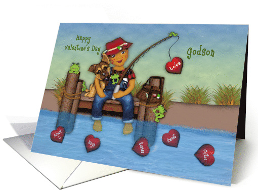 An adorable little boy fishing off the edge of the dock with his arm around his sweet puppy. He has caught a red heart that says "Love". There are red hearts with Valentine sentiments floating in the water. There is a cute frog inside the little boys pocket. Inside message reads: " Such a sweet little boy who has caught the hearts of everyone around him. XXXOOO." Inside message may be changed by you