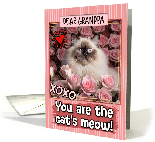 | Artist Notes: | Love and kisses from this super cute Himalayan cat posing amongst a giant bouquet of pink roses on a pink striped background with a gold colored trim and the text "dear grandpa you are the cat's meow!" A sweet card to send to your wonderful grandparent for Valentine's Day. |