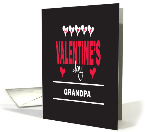 Grandpa will love this dramatic and masculine Valentine's card from you after he receives it this year. The large word "Valentine's" crosses the black backgrounded card, in bright red, in its part of the phrase "Happy Valentine's Day Grandpa" that is stacked at the center of the card. Partially hand lettered, the words create interesting contrast, as they sit atop each other and are peppered with white and red Valentine hearts. Your inside words to this special man are "Wishing a wonderful Grandpa a very special Valentine's Day, with love!"