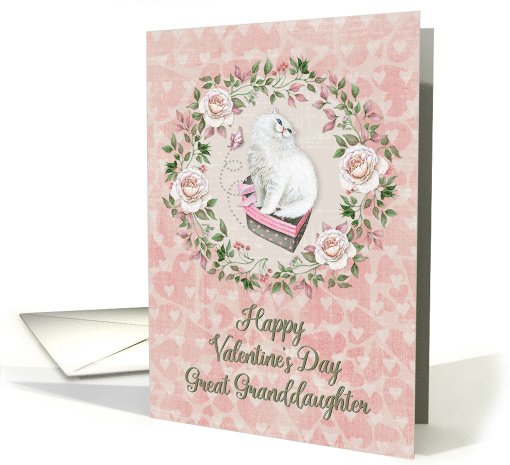 Send Happy Valentine's Day greetings to your great granddaughter with this adorable white kitten sitting on a heart shaped striped box with a bow. The cat is surrounded by a pink and green wreath made up of roses. The background is full of pink hearts.
