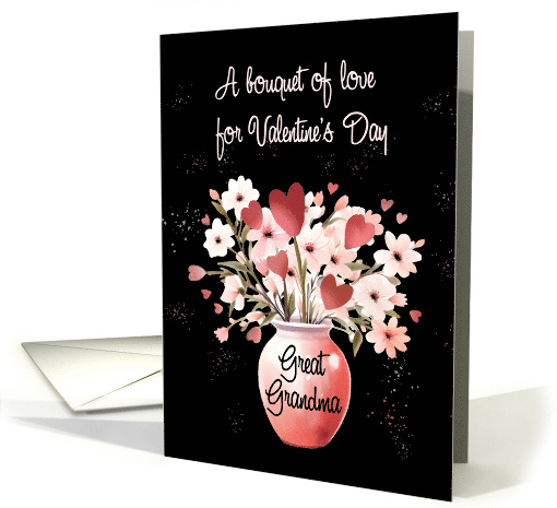 | Artist Notes: | Celebrate a special Great Grandma with this stunning Valentine’s Day card. The hand-painted watercolor vase, filled with soft pink flowers and hearts, sits on a bold black background, accented by artistic paint splatters. Thoughtful and unique, it’s a loving tribute to her warmth and kindness. |