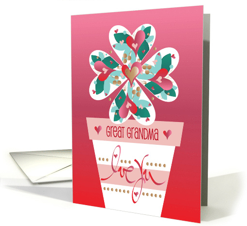 A four petaled heart flower is the highlight of this lovely love and heart-filled card that will delight your Great Grandmother on Valentine's Day this year. The flower sits in a flaring white and pink flower container, decorated with hearts and golden-colored dots and which has the flowing red hand lettered wording of "Love you" flowing over the front of the flower pot. The flower it holds is decorated with double hearts of red and golden-color, with dark and light green leaves that create a floral pattern on each of the four heart-shaped petals. The inside wording of this brilliant and love-filled card says "Hugs, kisses and Valentine's wishes from our hearts to yours." The inside wording can be edited, during ordering, if desired.