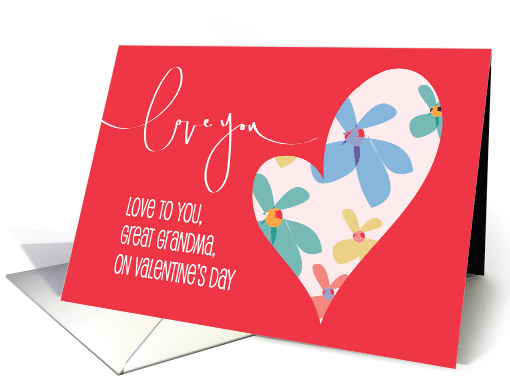 Give your Great Grandmother this stunning Valentine for the holiday this year. It's a bright and joyful card that will brighten her day and will be one she will be proud to display for everyone to see. A huge white heart fills the brilliant red background, with flowers that contain colors of teal, yellow, pink and blue. Each flower has a center with the same bright red as the card's background, making it a lovely celebration of Valentine's Day. Flowing across the top of the card, in white, are hand lettered words that says "Love you", with more words below, that add "Love to you, Great Grandma, on Valentine's Day". The card's inside wording says "Wishing you a lovingly sweet Valentine's Day, with love."