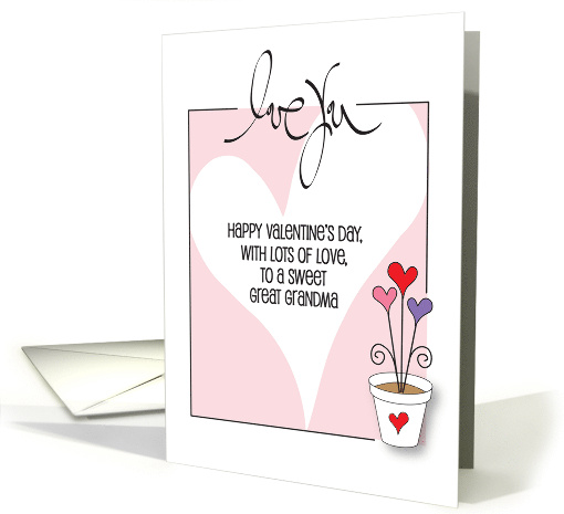 "Love You" is the elegantly majestic hand lettered wording that sweeps across the top of this very special valentine for your Great Grandma. The wording sits atop a large white heart, in which additional wording inside, that says "Happy Valentine's Day, with Lots of Love, to a Sweet Great Grandma". In the lower right corner a white flower pot holds a trio of pink, red and lavender heart flowers. The inside of the card says "Hugs, kisses and Valentine's wishes to you for a Valentine's Day filled with love and happiness!"