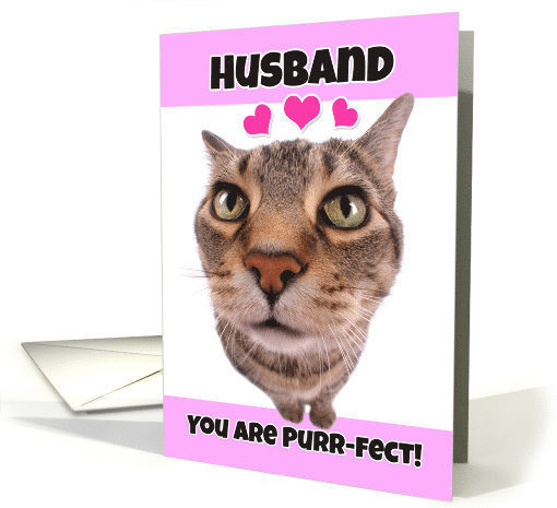 Wish your husband a Happy Valentine's Day with this adorable fisheye photograph of a tabby cat with little pink hearts all around his head.