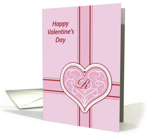 Valentines Day, monogram 'R' with filigree pink heart, Blank Note Card