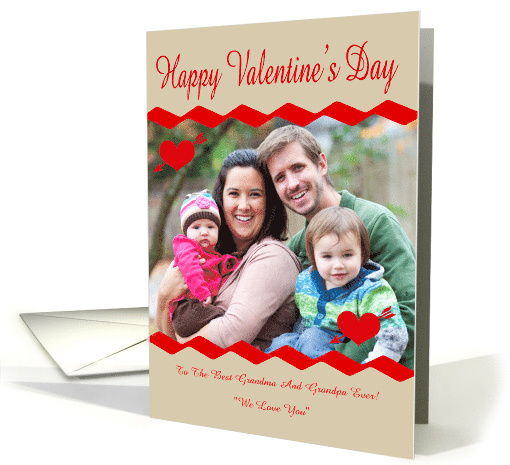 | Artist Notes: | Wish anyone Happy Valentine's Day with a customizable photo card featuring pretty red hearts with arrows and a red zig zag design to place your beautiful photo and a text box for a message of your choice. Background is a off white with red text. |