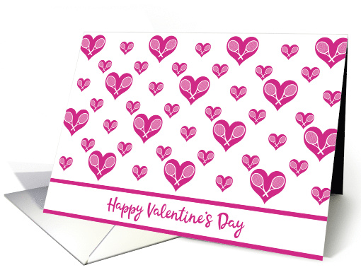 Lovely Valentine's Day card to or from Tennis player. Sweet pink hearts with white crossed tennis rackets. Happy Valentine's Day in pink. White background