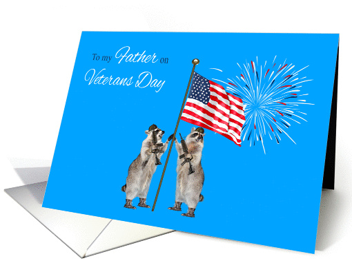 Veterans Day To Father, armed raccoons with flag and fireworks, blue