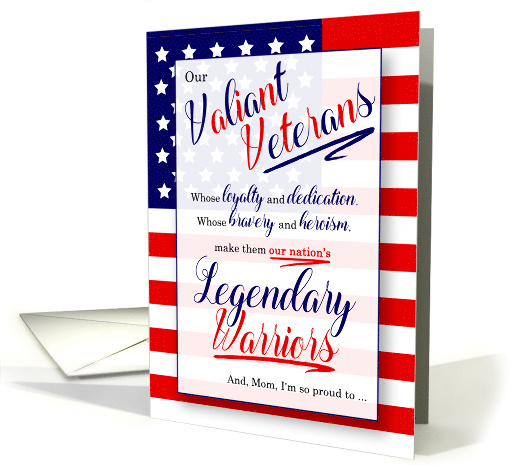 Artist Notes: | Veterans are our nation's legendary warriors who served our country with bravery, dedication and sacrifice. Honor your mother's service on Veterans Day with this patriotic greeting just for her. |