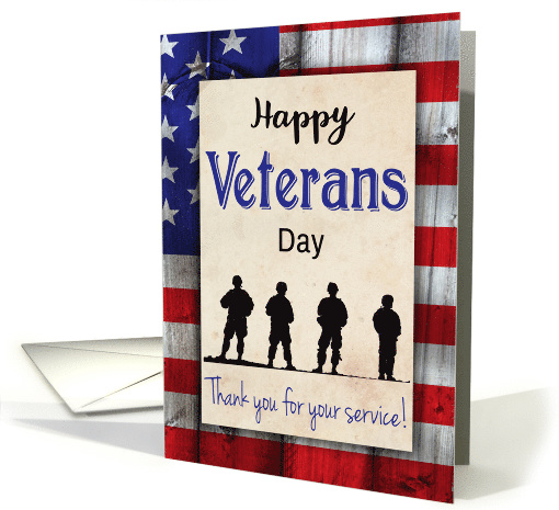 American flag as a background with silhouette troops for Veteran’s day card. Wish a veteran a wonderful day with this patriotic card. Design © 2018 Julia Bryant.