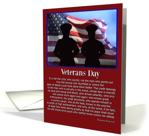 A veteran's day card with a famous quote by Theodore Roosevelt. "It is not the critic who counts; not the man who points out how the strong man stumbled or where the doer of deeds could have done them better. The credit belongs to the man who is actually in the arena, whose face is marred by dust and sweat and blood; who strives valiantly; who errs and comes short again and again; who knows great enthusiasms, the great devotions; who spends himself in a worthy cause; who at the best, knows in the end the triumph of high achievement, and who, at the worst, if he fails, at least fails while daring greatly so that his place shall never be with those timid souls who neither know victory nor defeat."