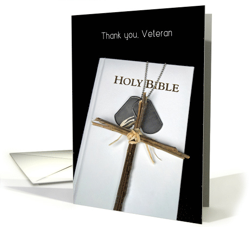 Title: | Veterans Day military dog tags and cross on white Holy Bible |