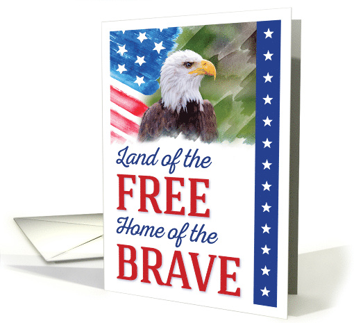 Wish someone a Happy Veterans Day with this patriotic and colorful design featuring the title, "Land of the FREE Home of the Brave." Type appears with brushed effect composite image of eagle and American flag and white stars on right border.