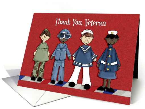 | Artist Notes: | Send thanks to a special Veteran with this military themed card with cartoon-style images of four branches of the military, including the Army, Air Force, Navy and Marine on red background with red, white a blue strip. Created with artwork from DigiWeb Studio. |
