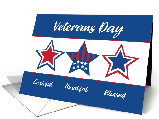 The front of the card features a deep blue background, symbolizing the significance of Veterans Day. Three stars shine prominently in red, white, and blue, representing the patriotic colors of the United States. Under each star, the following words are elegantly written: "Thankful" - Expressing gratitude for the selfless dedication and sacrifices made by our service men and women. "Grateful" - Conveying deep appreciation for their unwavering commitment to protecting our freedoms. "Blessed" - Recognizing the fortunate position we are in due to the bravery and sacrifices of our veterans