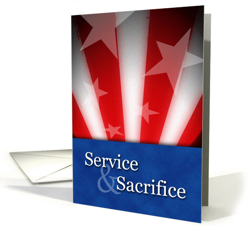 Veteran's Day greeting card features graphic elements from the red, white and blue American flag. Stars are transparent over the stripes which appear to be in a spotlight. Deep blue bottom border has the words "Service & Sacrifice" bold and large in a beautiful script font with a drop shadow. Perfect for the military person in your life that you would like to honor and thank.