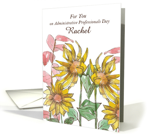 For a valued administrative professional on the special day honoring their skill and effort decorated with warm yellow sunflowers and sprigs of mauve leaves hand drawn with sepia ink and watercolor. Customize the card with their name and your own personal message inside.
