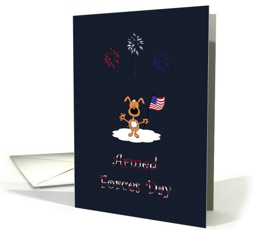 | Title: | Puppy Dog Holding USA Flag, Fireworks, Armed Forces Day Card |