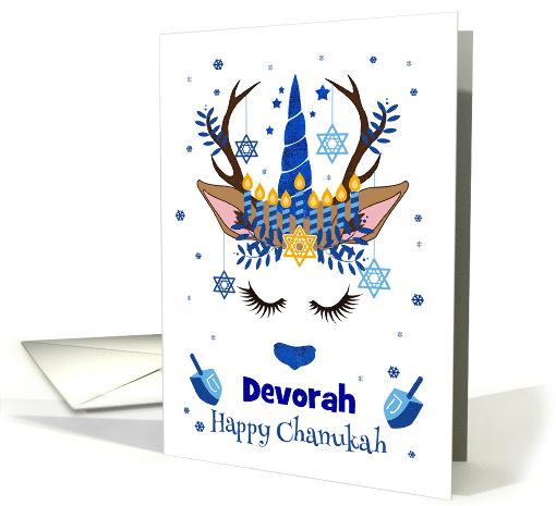 A fun cute reindeer/unicorn with cute Menorah headdress custom to your own name.