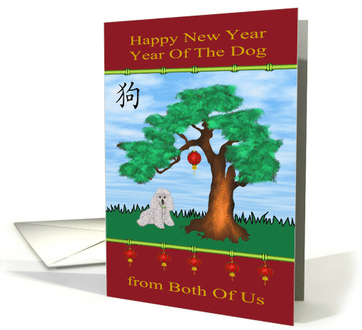 Wish anyone, in general, a Happy Chinese New Year from both of us, the year of the dog with a card featuring a cute dog under an Asian tree with a lantern hanging from its branch against a pretty, partly cloudy sky. The background has Chinese lanterns hanging from bamboo with golden color text. Design by Laurie Schneider, elements by HF-Projekte, La Galerie de Jackie. Chinese New Year starts a new animal's zodiac year. In China, each lunar cycle has 60 years and 12 years is regarded as a small cycle. Each of the 12 years is defined by an animal sign: Rat, Ox, Tiger, Rabbit, Dragon, Snake, Horse, Sheep, Monkey, Rooster, Dog, and Pig.