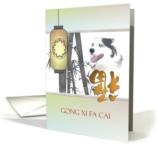 Profile of a husky behind bamboo foliage, with the Chinese character for luck written in gold. The character is written upside down to symbolize luck coming in. To the front hangs an ornate paper lantern. The top and bottom banners are colored in a dual shade of soft blue and green.