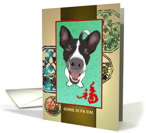 Cute dog looking up at you. Beside our four-legged friend sits the Chinese character for luck written in a stylized form. The image is set on a patterned sea green colored backing with a red frame. Behind the frame, a deep bronze colored banner runs down the length of the card. A translucent beige colored background is decorated with abstract designs in shades of blue, green, red, yellow and orange.