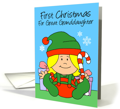 Great Granddaughter's First Christmas featuring a cute, cartoon baby girl Elf. The baby girl is sitting in front of presents and snowflakes are falling from the sky. A cute design for a newborn great grandchild on Christmas.
