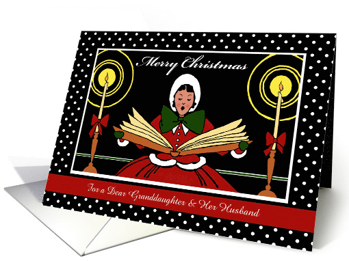 | Artist Notes: | Custom front, add your text to the cover of this Christmas card for a granddaughter and her husband. Graphic illustration of a girl in festive holiday dress singing a song from a large songbook. Contrasting color scheme with white polka dots on black. |