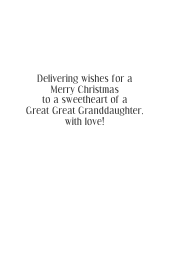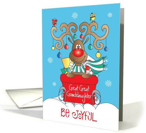 This darling Christmas card is one that your great great granddaughter will love, with its wording of "Be Joyful" that is written below the huge antlered reindeer above. The red nosed reindeer, with the huge oval red nose, sits in a large red sleigh that has curly silver runners, amidst mounds of billowing white snow. He has decorative red, yellow, blue and green Christmas ornaments dangling from his huge, brown antlers, as he carries all sorts of wrapped gifts to children everywhere across the snow. The wording "Great Great Granddaughter" is hand lettered, in white, on the front of his sled. The card's inside wording says "Delivering holiday hugs to a favorite Great Great Granddaughter!"