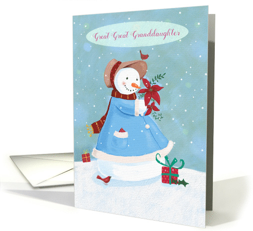 ©DaleSimpson. To have a Great Great Granddaughter is an extra special joy so why not send them this lovely illustrated Holiday card with a whimsical snow lady all dressed in her blue fur trimmed winters coat holding a sprig of seasonal red poinsettia flowers.