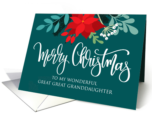 A lovely card with Christmas florals (including poinsettia, rosehip, Winter berries and pine branches) on the top of the card with the words Merry Christmas to my wonderful great great granddaughter on the front of the card.