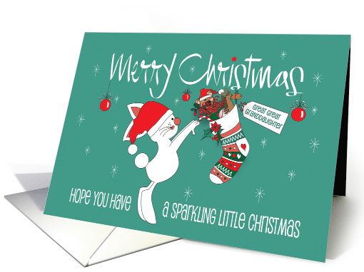 This hand lettered Christmas card with a little white bunny looking into her decorated red, green and white stocking for the holidays, is a sure delight for your great great granddaughter. The bunny stands on her hind paw's tip toes, as she reaches up to the stuffed stocking that Santa has left for her, filled with a candy cane, a wrapped gift and a little horse. "Merry Christmas" is hand lettered, in white, across the top of the card, with letters that hold the stocking and several bright and shiny ornaments. The inside wording of the card says "Wishing you Christmas joy, with love!"