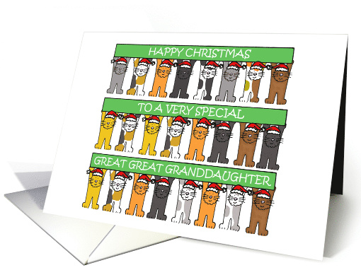A cute card showing cartoon kittens standing up on their back legs sending Christmas wishes to any much loved Great Great Granddaughter.