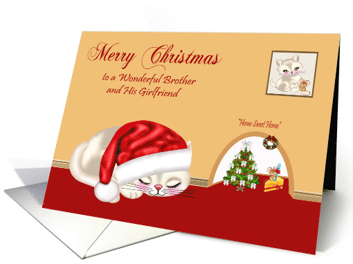 Fun facts: Mice are hardy creatures that are found in nearly every country and type of terrain. They can live in forests, grasslands and manmade structures easily. Mice typically make a burrow underground if they live out in the wild. Their burrow helps protect them from predators. Their natural predators are cats, birds, wild dogs and foxes. Wish your brother and girlfriend Merry Christmas with a cute cat sleeping by a mouse hole with a mouse sitting in his foyer on a piece of cheese with a fork next to a tree with a wreath hanging on the outside of his Home Sweet Home.