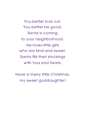 For the young goddaughter who loves purple and being a snow bunny. Created in fun girly hues and a winter scene, featuring a watercolor bunny in a winter sweater, galoshes, sunglasses and a hat. Your godchild is sure to smile when she receives this holiday greeting card.