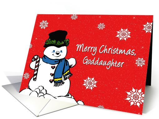 Cute little snowman wishing your goddaughter a Merry Christmas. Isolated on red background with snowflakes.