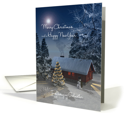 A whimsical fantasy Christmas card for your Godmother. An attractively snowscene with a cottage, Christmas tree and a snowman . Inside there is a text which you can customize to something very personal.