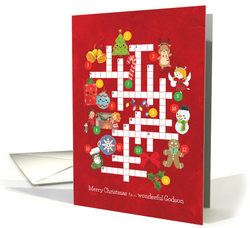 Oh what fun a wonderful Godson in your life will have working this special Christmas puzzle. Bright Christmas clues in picture form will keep him busy and engaged. Here are the answers, in case he asks: 1. Bells, 2. Tree, 3. Reindeer, 4. Ornament, 5. Lights, 6. Present, 7. Candy Cane, 8. Decorating, 9. Angel, 10. Snowman, 11. Snowflake, 12. Gingerbread, 13. Bow, 14. Holly, 15. Stocking. MATTE FINISH MUST REMAIN SELECTED as it is not possible to write on the glossy finish. Glossy cards have a coating and do not easily allow for writing. Merry Christmas to a wonderful Godson!