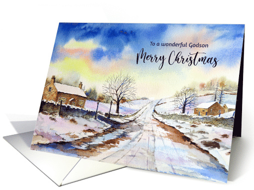 | Artist Notes: | Watercolor painting by myself Farida Greenfield of Wintery Lane. A beautiful scene of a crisp winter day with a stone farmhouse on the left hand side and barn and stable on the right hand side with stone wall along the snow covered road and trees on the background. The card is For Godson on Christmas. |