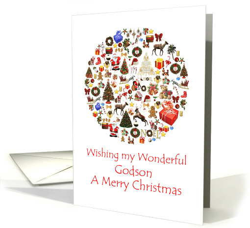 | Artist Notes: | Wish your godson a Merry Christmas. A circle full of Christmas goodies, including Santa, lots of presents, Christmas trees, and reindeer. A joyful Christmas card for someone special. |