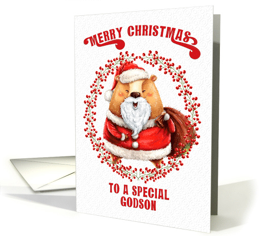 | Artist Notes: | A smiling jolly bear dressed as Santa is bringing your Godson fun Merry Christmas greetings. The Santa bear is holding a big toy sack and is placed inside of a big red berry wreath.The background has the appearance of texture which is digitally created. |