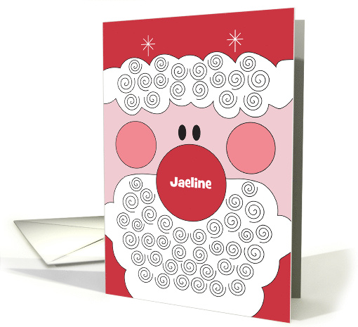 This large Santa face card is one that every one of your granddaughters will enjoy receiving from you this year. Santa's big round red nose is filled with their name, at the very center of the card, personalizing it for each girl. The rest of the card is red and white with face details of a huge Santa, big cherry cheeks, a spiral-filled beard and a red and white curly hat topping his head. Additionally delightful is the inside wording that says "Ho, Ho, Ho to one of Santa's favorites! Merry Christmas, with lots of love!"