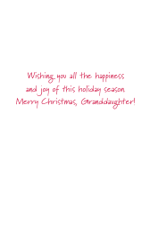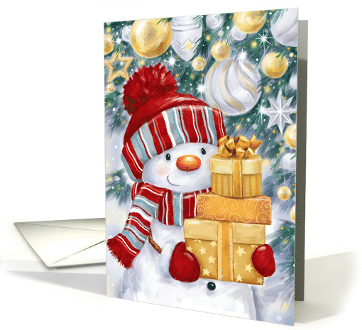 Cute snowman with red heat, scarf and glove holding golden packages of presents under the Christmas tree with golden and silver baubles, merry Christmas granddaughter.