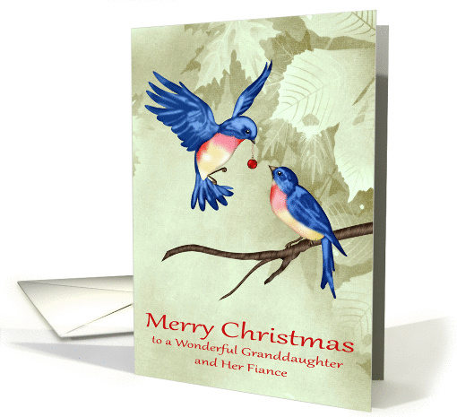 | Artist Notes: | Wish your wonderful granddaughter and her fiance a Merry Christmas with a card featuring a beautiful blue bird with a red ornament in his beak flying close to another blue bird sitting on a branch on a leafy background with dark text. Birds by Digital Designs by Elena |