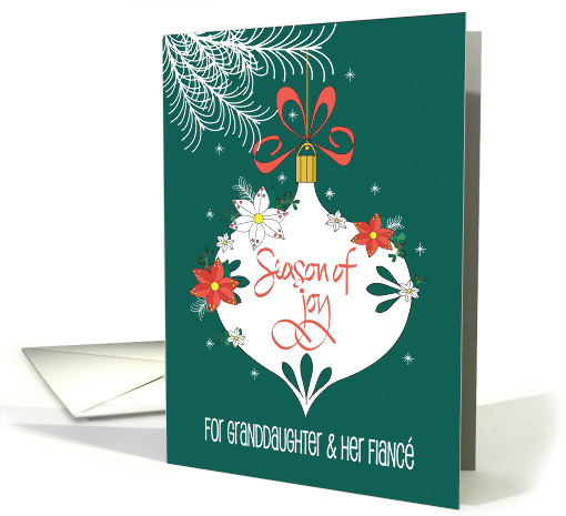 Your very special Granddaughter is getting married soon and you would like to find a touching card for both her and her Fiancé together. This beautiful card, with its lovely decorated and twinkling white hanging ornament, will evoke wonderful memories, in both of them, of fun tree trimming get togethers at Christmas. The ornament is embellished with a myriad of red, pink and white poinsettia flowers that we all love for the holidays. A tied up bow of red spiraling ribbon sits at the top of the holiday orb, above its pointed tip. "Season of Joy" is stunningly hand lettered, in pink, across the face of the white ornament, extending your holiday wishes to this special couple. Your inside wording says "Wishing a very special couple all the joys of the season, with love!"