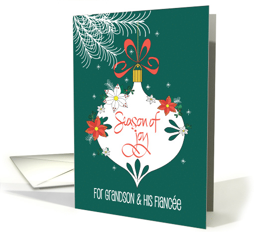 | Artist Notes: | Your Grandson is planning to be married soon and you would like to find a very special Christmas card this year for both of these two special people together. This lovely hanging Christmas ornament that glimmers with its brilliant coloring of white, red and brilliant green will be a reminder to your Grandson of the many holidays you shared together decorating the Christmas tree with ornaments much like this one. Hand lettered wording of "Season of Joy" fills the ornament with beautiful pink lettering, surrounded by several sizes of red and white poinsettias. The words "For Grandson & His Fiancée" cross the bottom of the card, below the point of the white ornament. The card's inside words say "Wishing a special couple all the joys of the season, with love!" |
